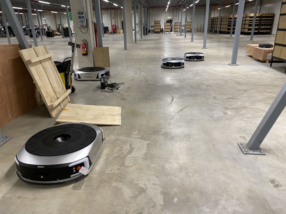 Die Flotte wächst! Inzwischen stehen die ersten Roboter auf der Fläche bereit und warten nur darauf, loszufahren, die Lagerregale huckepack zu nehmen und zur Übergabestation in die Kommissionierzone zu fahren, wo dann der schließlich Mensch das Picking der Artikel übernimmt. Jene Übergabestation und auch der Schutzzaun stehen bereits als nächstes auf unserer Liste der Aufbauarbeiten. Dann ist hier im Lager noch mehr zu sehen und natürlich halten wir Sie weiter auf dem Laufenden, was den Fortschritt betrifft.