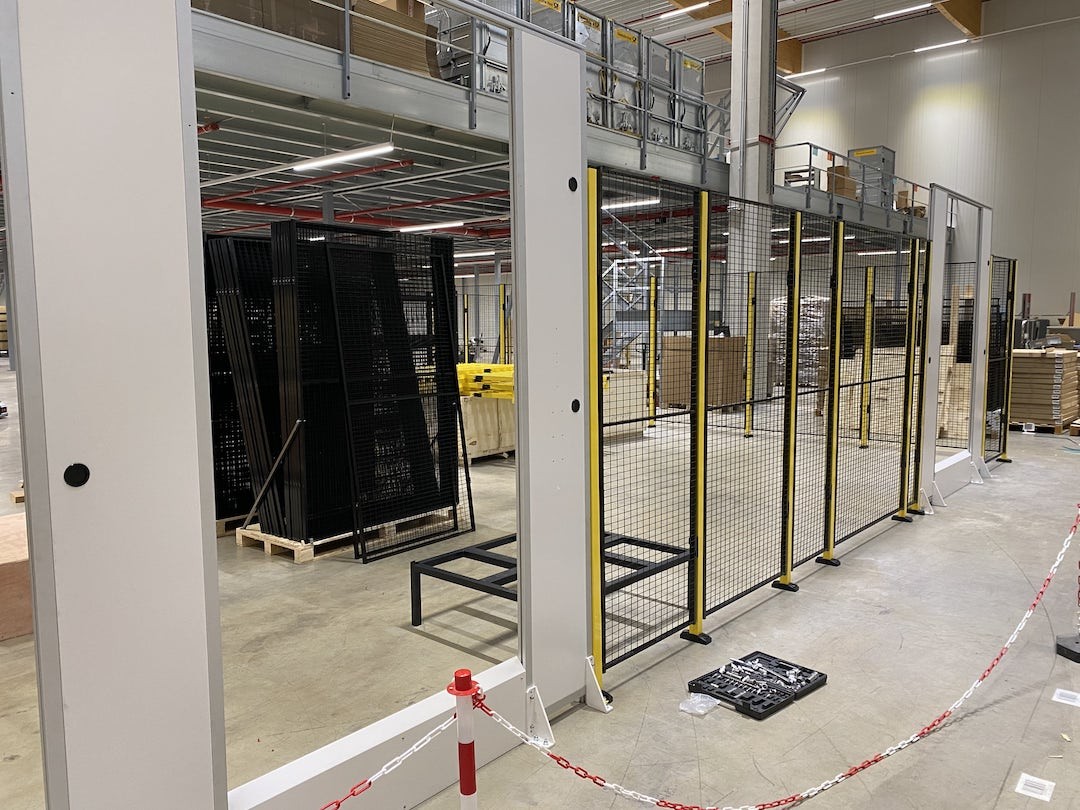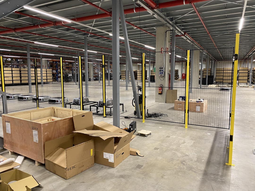 Das bedeutet im Umkehrschluss: Auf den Routen der insgesamt zehn autonom arbeitenden Roboter-Kollegen wird allerhand los sein. Um die Unfallrisiken für unser menschliches Kommissionierteam zu beseitigen, wird dieser Aktivitätsbereich durch einen Sicherheitszaun abgetrennt, mit dessen Aufbau wir auch bereits begonnen haben, wie auf den Fotos zu sehen. Auch die Pickstationen sind im Hintergrund zu erkennen. Sicher ist: Wir befinden uns allmählich auf der Zielgeraden und bewegen uns mit Riesenschritten auf die Fertigstellung dieses spannenden Projekts zu.